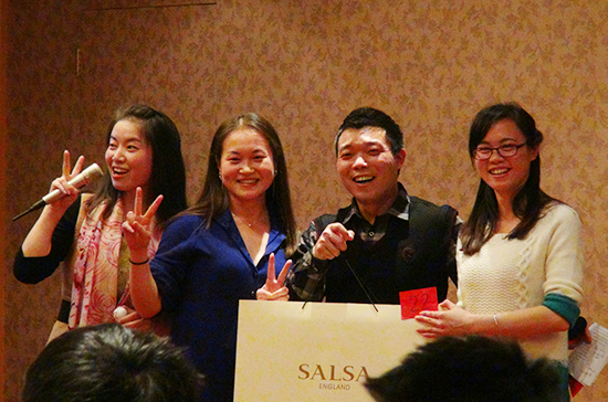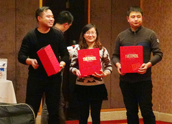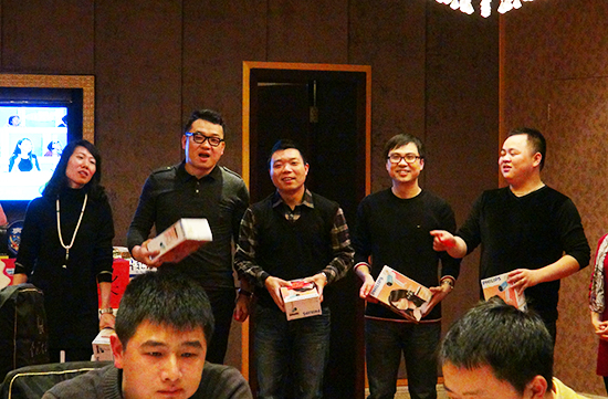 随后广角全员在世纪金源酒店举行了团拜晚宴。晚宴开始前杨总感谢大家在过去一年为公司付出的辛勤劳动,并对2013年度优秀人员进行表彰。晚宴期间穿插着抽奖、游戏等互动环节,整个晚宴现场充满了欢声笑语。