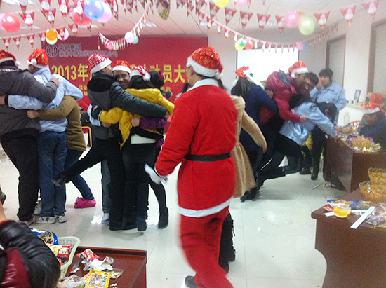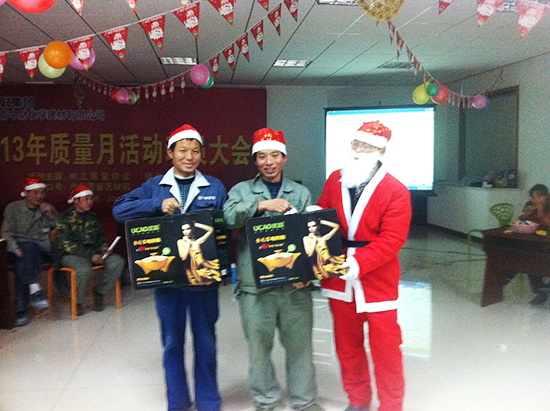 圣诞老人幽默搞怪的出场迎来了现场一阵阵的欢笑,诙谐可爱的圣诞老人将礼物派送到每一位寿星朋友手中。“纸尖传情”和“撕报纸”两个团队游戏把晚会的气氛推向了高潮,六位员工拿走了当天的大奖,仓储部的王金强、廖义清喜获一等奖——优越牌电热锅。