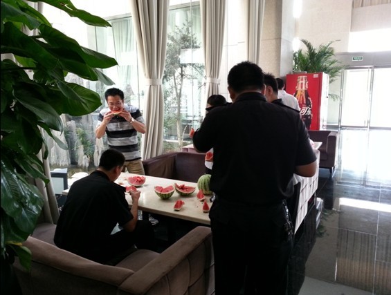 8月11日,物业管理处负责人金双喜、处长助理潘明华送来了西瓜,慰问大厦一线工作人员。
