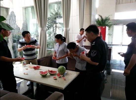 为了确保大厦高温炎热天气下的工作质量,维护大厦环境、安全以及设备正常运行。集团物业管理处为员工送去清凉、送去问候,为他们送去解暑西瓜、饮料、矿泉水、解暑药品等物品,并叮嘱他们在高温天气下作业,既要保证工作质量,又要注意身体;从多方面对员工给予关心和爱护,以确保酷暑季节员工的身心健康。