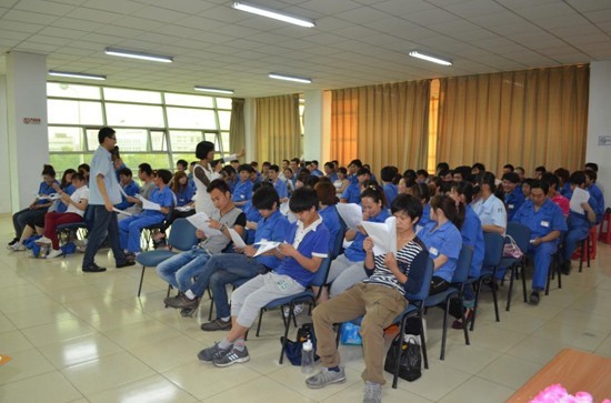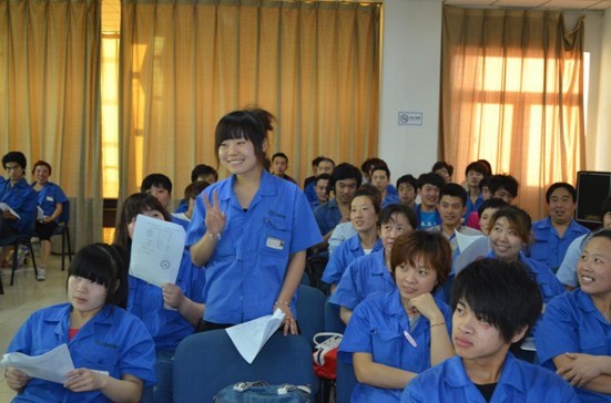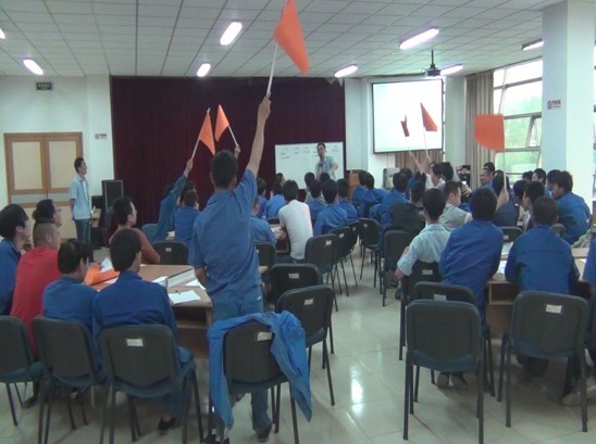 型材员工培训,分为旗开得胜和大家来找茬两个环节。旗开得胜环节,主持人带领各班组制作队旗,设计队呼,使用类比的方法再现了生产现场,传递着“现场管理其实就这么简单”的观念。大家来找茬环节,参训员工通过观看微电影“超级玛丽”,或多或少地找到了自己做现场时的影子,看到由于自己的不经意给别人带来的影响。在主持人的鼓舞下,员工反观自身,勇敢地说出了自己在工作时不符合现场管理标准的种种表现。