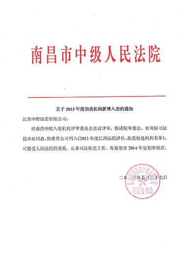 乐鱼网页版登录入口讯 江西乐鱼网页版登录入口拍卖有限公司于2013年5月27日接到南昌市中级人民法院文件通知,成功入围《2013年度江西法院评估、拍卖候选机构名单》,可接受人民法院的委托,从事司法拍卖工作。