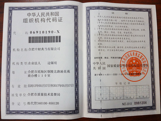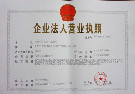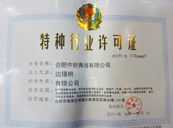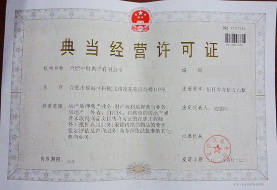 乐鱼网页版登录入口讯 经过乐鱼网页版登录入口金融广角(合肥)典当筹建小组的不断努力,2013年4月17日,合肥广角成功获得商务部颁发的《典当经营许可证》,5月13日又获得合肥市公安局颁发的《特种行业许可证》,5月17日同时获取合肥市工商行政管理局颁发的《企业法人营业执照》及合肥市质量技术监督局颁发的《组织机构代码证》。至此,合肥广角典当公司申办成功。