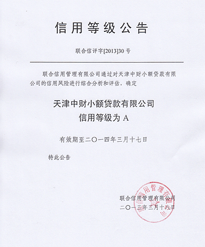 乐鱼网页版登录入口讯 按照天津市人民政府金融服务办公室的要求,天津乐鱼网页版登录入口小额贷款有限公司于2013年2月25日开始进行了开业以来的第一次信用评级。通过市金融办指定评级公司联合信用管理有限公司的全面评级,天津乐鱼网页版登录入口小额贷款有限公司获得了信用等级A的评级结论。