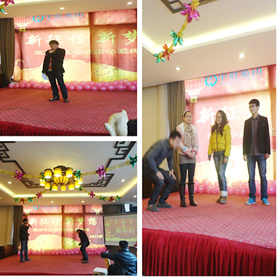 紧接着,本次团拜会的节目表演在公司领导们《明天会更好》的歌声中开始,歌曲、相声、抽奖、游戏(动物蹲、猜灯谜、你做我猜)使整个现场气氛浓郁、热烈,掌声、欢笑声此起彼伏,传递着大家快乐的心情!
