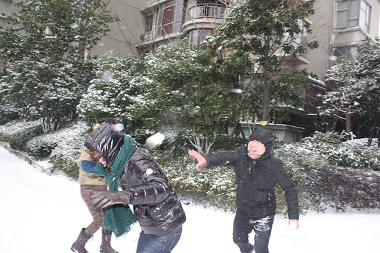 寒风凛冽,漫天飞雪,大伙们不顾寒冷,从地面的积雪中抓起雪揉成小雪球,向彼此扔去,雪球散落在对方的头上、身上、甚至直接命中对方的脸,现场不时引来阵阵欢笑声,高涨的热情让大家早已忘记了严寒。这场“雪战”持续了半小时,在愉快的气氛中结束。