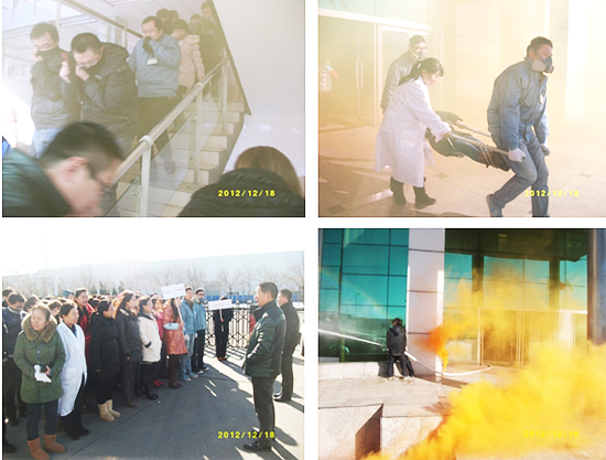 11点20分,烟雾弹拉响,逃生演练正式开始。浓烟瞬间吞噬整个办公楼,火势严峻。总指挥边经理接到火灾报警,迅即指令向119、120请求救援,应急工作人员迅速行动。员工在疏散小组的带领下有序地从安全通道撤离。同时救火小组立即铺设水带、拎起灭火器冲向着火点,救援小组快速搜救被困人员,迅速将伤员转移至安全地点紧急救护。警戒人员维护现场秩序。参演员工从收到警报到集合共用时5分钟。