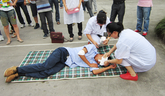 15时,随着演习总指挥的一声令下,紧急疏散演练活动正式开始。一会儿,公司行政办公楼发烟器冒烟模拟办公室火情,“浓烟”瞬间笼置大楼,“火势”异常凶猛。紧接着,厂区消防控制中心警铃响起,公司领导迅即指令向119、120请求救援,组织人员从大楼应急通道疏散,应急工作人员迅速行动。公司义务消防队员立即铺设水带、拎起灭火器冲入着火点,救援人员快速反应、紧急搜救被困人员并抢救贵重物资,警戒人员第一时间清理消防通道、维护现场秩序。 80多名员工用毛巾捂着嘴巴和鼻子弯着身子在楼层疏散人员的带领下有序地从安全通道撤离至办公楼广场集合,一个“伤员”被安全转移至临时救护站接受简单处理,整个过程用时约8分钟。