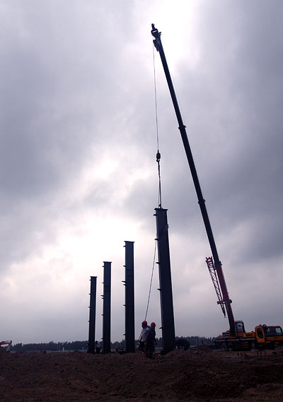 2012年8月9日,开工的第28天,在台风“海葵”来临之前,PVC车间开始安装钢结构第一排的柱子。