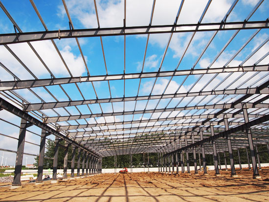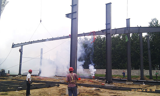 2012年8月14日,开工第33天,PVC车间钢结构安装屋面大梁。