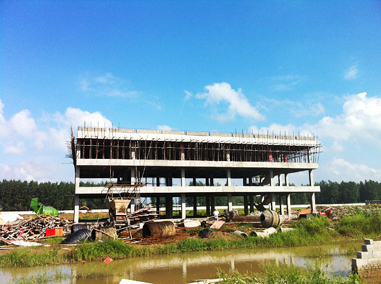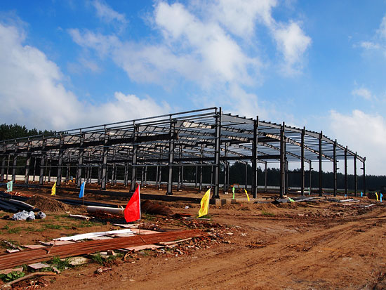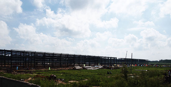 2012年8月22日,开工第41天,跨度2×27米,长度108米的PVC车间结构封顶,主体结构完成。