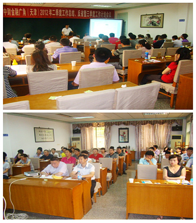 本次会议由管理部负责组织实施,典当总经理杨总主持。首先,由杨总及财务总监张总带领大家学习集团下发的浙中董局字[Ⅳ]第194 号文件---关于下发《关于设立河南河财管道有限公司等问题的原则意见》的通知,然后由财务总监对我广角2012年第二季度财务情况做具体数据分析,接着由广角五虎将分别将其部门二季度的经营、业务拓展、团队管理培训情况及三季度工作计划等做系统总结及ppt展示。