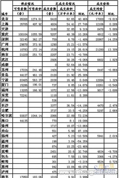 注释: 1 、北京、上海、深圳、天津、长沙、东莞、南京、济南、青岛、苏州、厦门、福州、贵阳、包头、温州、泸州数据为商品住宅交易数据,其他城市为商品房交易数据(长沙、泸州为住宅期房数据)。