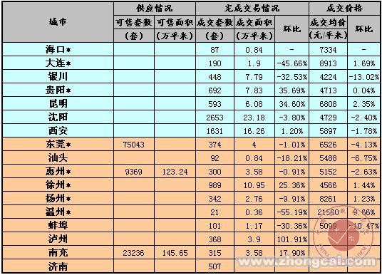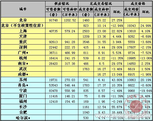 1.北京、上海、广州、深圳、天津、长沙、东莞、南京、青岛、苏州、厦门、福州、大连、沈阳、西安、三亚、贵阳、温州数据为商品住宅交易数据,其他城市为商品房交易数据。