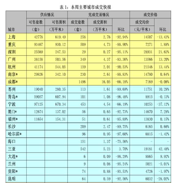 受春节和政策双重影响,本周监测的30个城市,九成城市成交量出现下跌。其中五成城市跌幅超过90%。重点城市均出现成交量下滑态势,深圳跌幅更是超过95%。价格方面重点城市中仅上海、成都出现下滑,深圳涨幅21.63%,其他城市变化不大。
