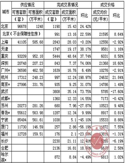 1.北京、上海、广州、深圳、天津、成都、长沙、东莞、南京、青岛、苏州、厦门、福州、大连、惠州、三亚、贵阳、温州、包头数据为商品住宅交易数据,其他城市为商品房交易数据。