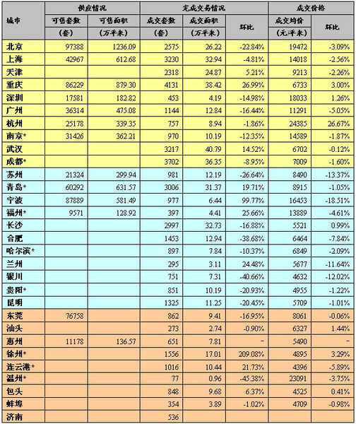 1.北京、上海、广州、深圳、天津、成都、长沙、东莞、南京、青岛、苏州、厦门、福州、大连、惠州、三亚、贵阳、温州、包头数据为商品住宅交易数据,其他城市为商品房交易数据。