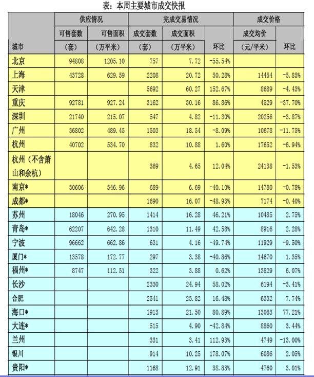 重点城市中,4个城市成交量环比上涨,天津涨幅最大,达152.67%,重庆和上海涨幅超过50%,杭州成交量与上周基本持平。其余成交量下跌城市中,北京,、成都跌幅明显,北京下跌55.54%,成都下跌48.93%。