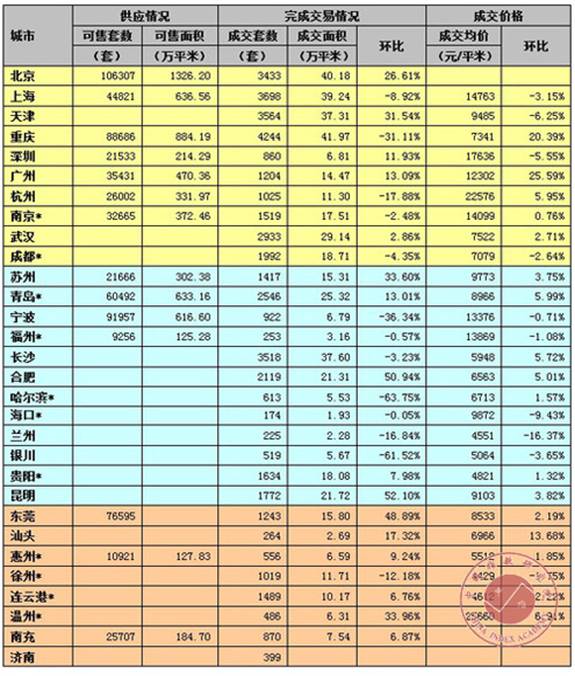 本周监测的30个城市中,16个城市成交量环比下跌。其中6个城市跌幅超30%,4个城市涨幅高于30%,成交量陷入两极分化。重点城市中,天津、北京等5个城市成交量环比上涨,其中,天津位居涨幅榜首,达31.54%,北京继续受保障性住房成交影响,涨幅较大。重庆、杭州等5个城市成交面积均环比下跌,其中重庆、跌幅较大,达31.11%,杭州跌幅也超过15%。本周多数城市成交价格稳定,但其中广州、重庆价格上涨超过20%,兰州则环比下跌16.37%。