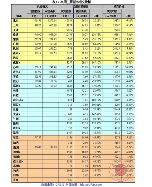 “十一”长假过后,多数城市楼市成交量大幅回升,其中重庆、海口、大连等6个城市涨幅在100%以上,近1/3的城市成交量涨幅在50%左右。重点城市中,重庆、成都成交面积分别上涨167%、131%,南京、武汉和广州涨幅均超过50%;与此相反,本周深圳成交面积下跌55%,上海下跌12%。