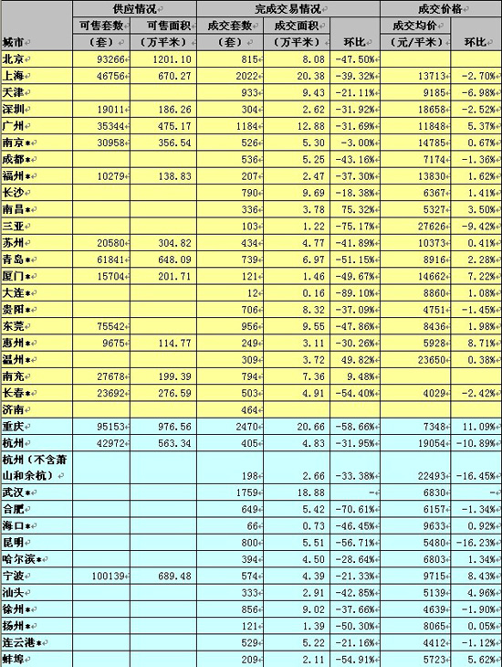 表:本周主要城市成交快报