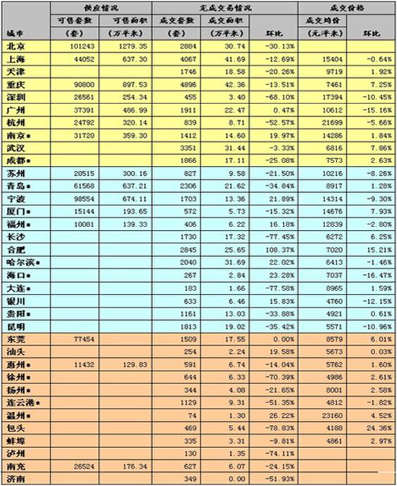 据中国指数研究院监测显示,本周,主要城市楼市成交量普遍下跌。监测的35个城市中,24个城市成交量环比下跌,18个城市跌幅超20%,5个城市跌幅在70%以上。重点城市中,除南京和广州成交量环比上涨外,其余8个城市成交量均下跌,深圳跌幅最大,达68.10%,杭州次之,跌幅超50%,北京、成都和天津跌幅亦超20%;此外,南京成交量环比上涨19.97%,广州微涨0.47%。
