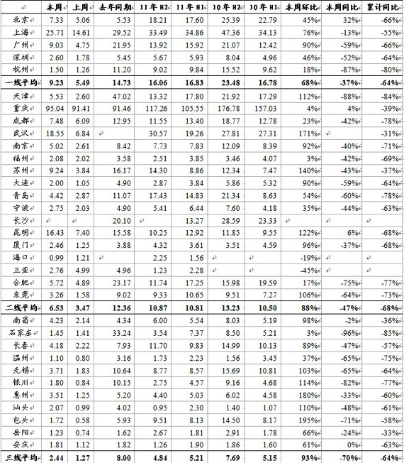 表1:33个典型城市一手房成交对比(单位:万平方米)(销量同比都是与春节假期后第2周比,下同)