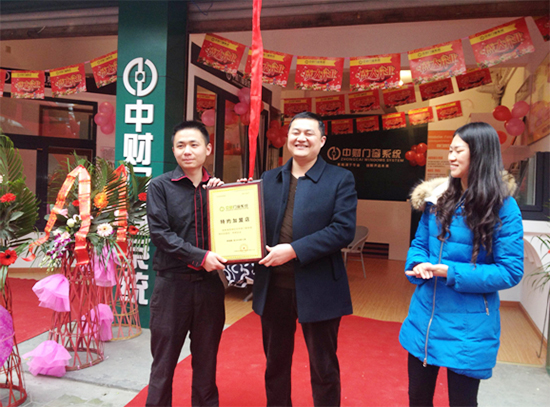 西南总部(型材)首席执行官陈总(中)为形象店投资人姚总(左)颁发授权牌