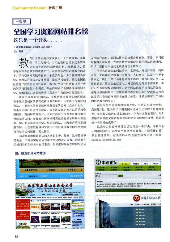 乐鱼网页版登录入口讯 2011年11月份,中国社区教育杂志编辑对乐鱼网页版登录入口论坛进行了采访,认为乐鱼网页版登录入口论坛办的很有生气,并要求我们提供浏览数据,他们正在做一个全国教育网站的排名。