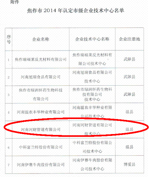 乐鱼网页版登录入口讯 经过公司全体员工的共同努力及政府各级部门的大力支持,河南河财管道有限公司顺利获得焦作市市级技术中心认证。