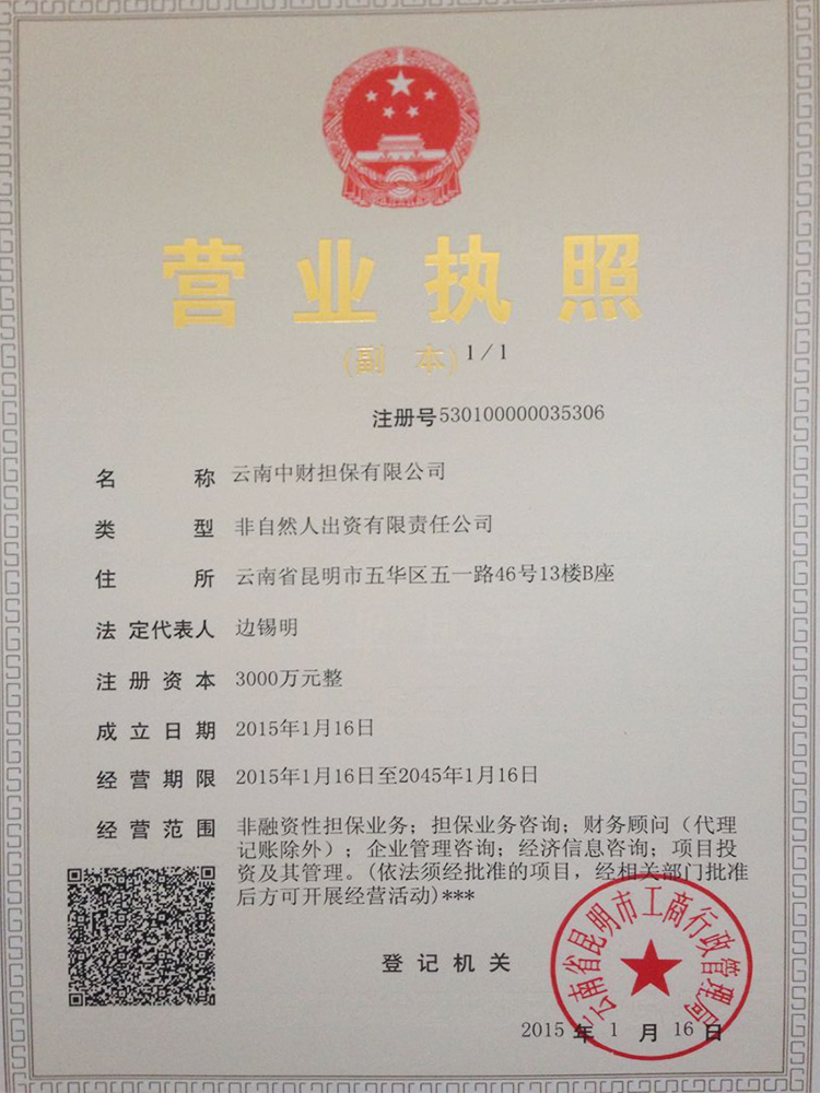 乐鱼网页版登录入口讯 乐鱼网页版登录入口金融广角(昆明)在乐鱼网页版登录入口集团领导的全力支持和配合下,经过乐鱼网页版登录入口金融广角(昆明)全体员工的不断努力,于2015年1月19日成功申办云南乐鱼网页版登录入口担保有限公司,取得营业执照。