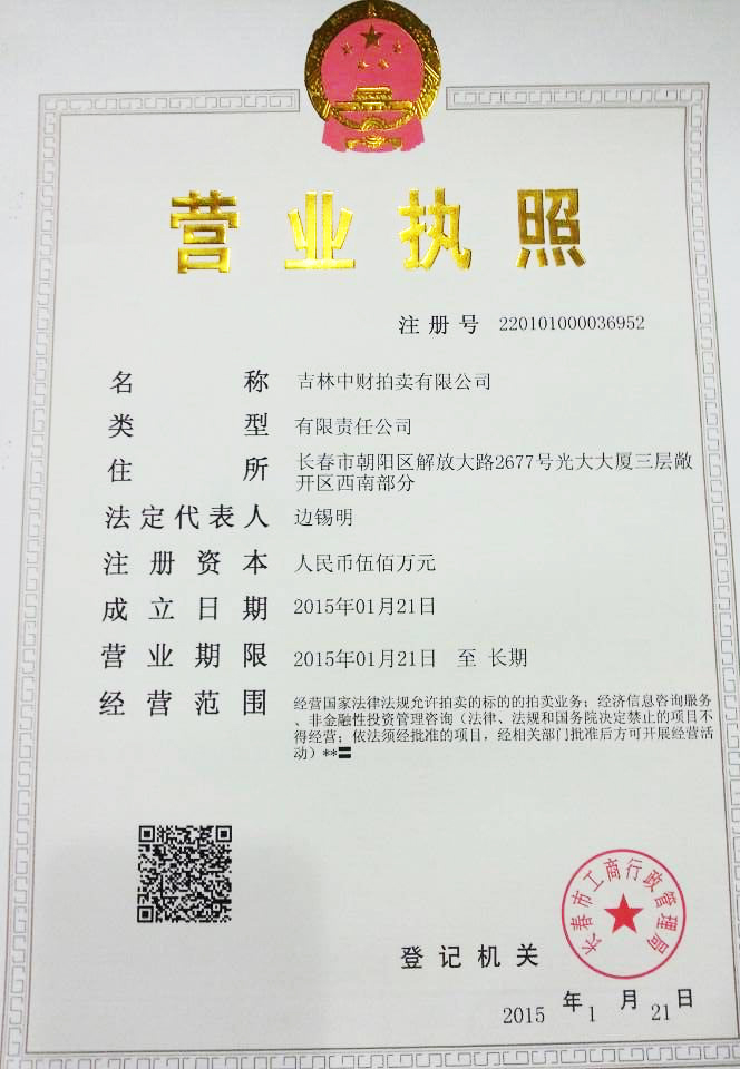 乐鱼网页版登录入口讯 在集团领导及相关部门配合支持下,经过乐鱼网页版登录入口金融广角(长春)全体员工的共同努力,于2015年1月14日取得吉林省商务厅颁发的《拍卖经营批准证书》,于1月21日取得长春市工商局颁发的《营业执照》,至此吉林乐鱼网页版登录入口拍卖有限公司申办成功。