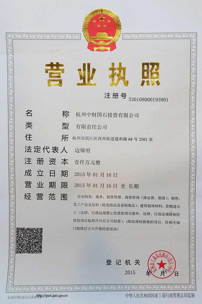 乐鱼网页版登录入口讯 2015年1月16日杭州市工商局高新区(滨江)分局正式颁发杭州乐鱼网页版登录入口国石投资有限公司营业执照。