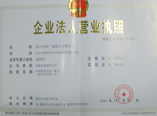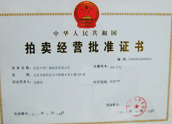此前,乐鱼网页版登录入口金融广角(北京)已通过了北京市商务委包括现场勘察在内的各项严格审查,于2011年11月14日取得了《拍卖经营批准证书》。此次获取工商营业执照后,组织机构代码证、税务登记证、开户许可证、基本帐户开立等相关工作随之紧锣密鼓地展开。