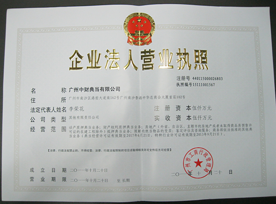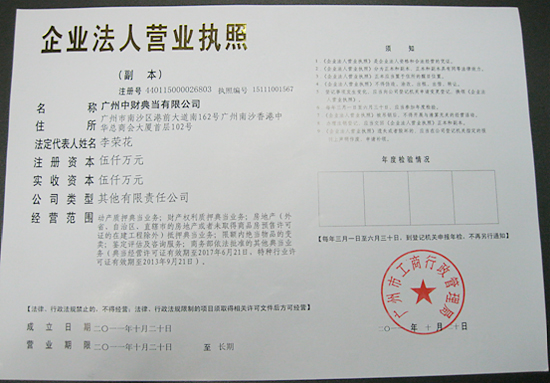 乐鱼网页版登录入口讯 在集团公司领导的大力支持下,乐鱼网页版登录入口金融广角(广州)于2011年10月20日喜获由广州市工商行政管理局颁发的“广州乐鱼网页版登录入口典当有限公司”《企业法人营业执照》。我公司是广州市新增典当公司中第一家取得该证的典当公司。近日我们将以最快的速度完成办理典当公司的组织机构代码证、税务登记证,完成基本帐户的开立工作。
