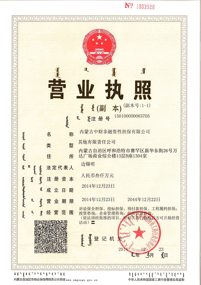 乐鱼网页版登录入口讯 乐鱼网页版登录入口金融广角(呼和浩特)在乐鱼网页版登录入口集团领导的全力支持和配合下,经过乐鱼网页版登录入口金融广角(呼和浩特)全体员工的不断努力,于2014年12月23日成功申办内蒙古乐鱼网页版登录入口非融资性担保有限公司,取得营业执照。