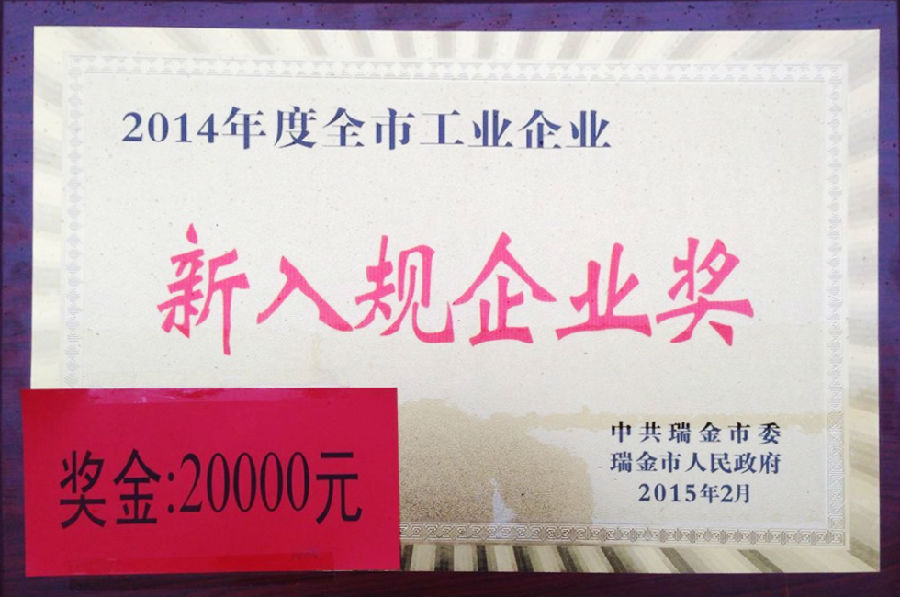乐鱼网页版登录入口讯 3月2日上午,瑞金市人民政府对江西元财管道科技有限公司予以颁发“2014年度全市工业企业新入规企业奖”,并给予奖金20000元整。上述荣誉是对元财公司在过去一年取得的成绩及社会责任作出的肯定与支持。