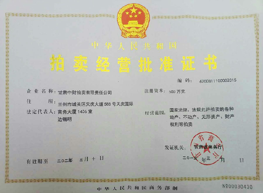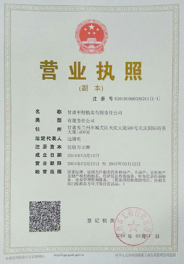 乐鱼网页版登录入口讯 在集团领导和相关部门支持下,在甘肃省新拍卖公司申办冻结期内,经乐鱼网页版登录入口金融广角(兰州)全体员工积极努力,克服重重困难,充分展示公司、营销乐鱼网页版登录入口,甘肃省2014年下半年度唯一同意申报的新拍卖公司----甘肃乐鱼网页版登录入口拍卖有限责任公司申办成功,并于2015年3月13日顺利取得了拍卖许可证、工商营业执照。