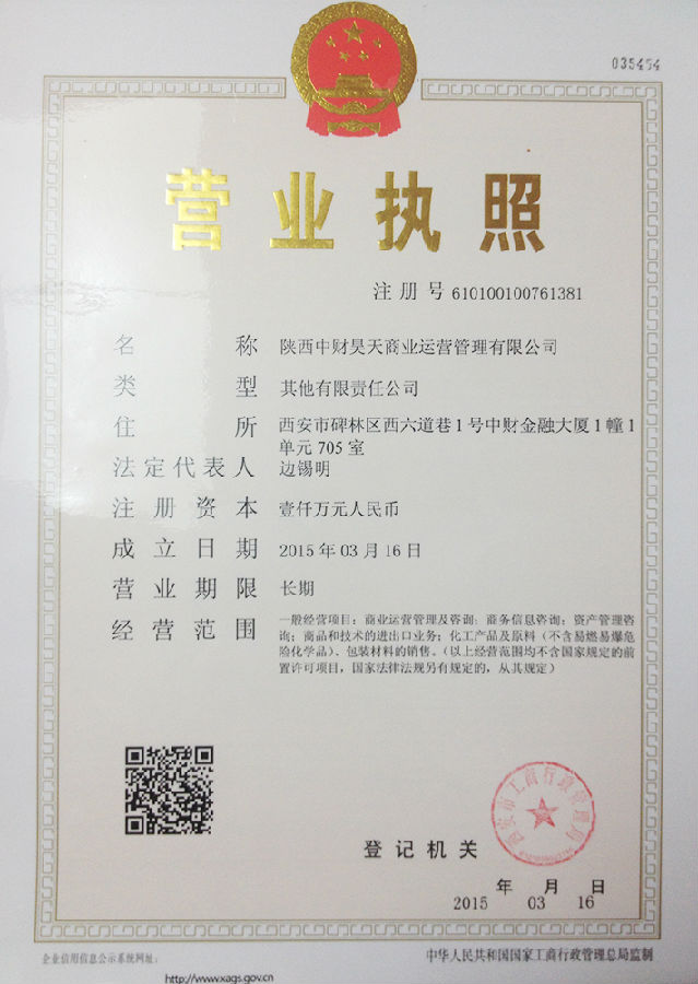 乐鱼网页版登录入口讯 在乐鱼网页版登录入口集团领导的大力支持和精心指导下,陕西乐鱼网页版登录入口昊天商业运营管理有限公司于2015年3月16日完成工商登记,西安市工商局正式颁发营业执照。