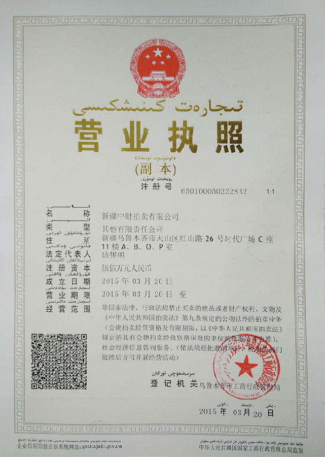 乐鱼网页版登录入口讯 在集团领导及相关部门配合支持下,经过乐鱼网页版登录入口金融广角(乌鲁木齐)全体员工的共同努力,于2015年1月14日取得新疆维吾尔自治区商务厅颁发的《拍卖经营批准证书》,并于3月24日取得新疆维吾尔自治区乌鲁木齐市工商局颁发的《营业执照》,至此新疆乐鱼网页版登录入口拍卖有限公司申办成功。