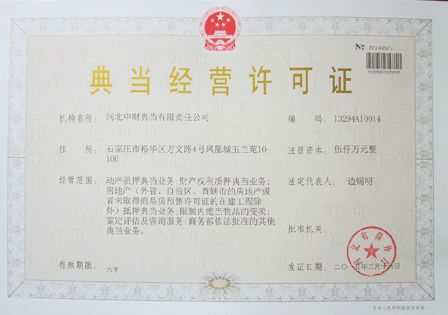 乐鱼网页版登录入口讯 在集团领导和相关部门的大力支持下,石家庄广角经过几年的不懈努力,于2015年4月2日取得《典当经营许可证》。