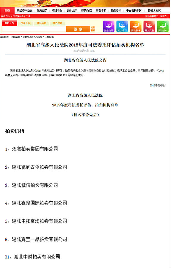 乐鱼网页版登录入口讯 近日,武汉广角接湖北省高级人民法院通知,湖北乐鱼网页版登录入口拍卖有限公司成功入围该院,成为2015年度司法委托评估拍卖机构之一。