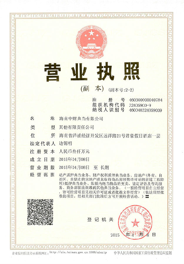 乐鱼网页版登录入口讯 2015年4月8日,乐鱼网页版登录入口金融广角(海口)喜获海南乐鱼网页版登录入口典当有限公司营业执照!海口广角在集团领导的全力支持和各处室积极配合下,经过不懈努力后终于喜得佳绩,在短短的半年时间内陆续成立了海南乐鱼网页版登录入口非融资性担保有限公司和海南乐鱼网页版登录入口典当有限公司二家公司。海口广角将再接再厉,争取在最短的时间内完成拍卖公司的申办。同时,海口广角力争尽快启动业务权限,在业务上再勇夺佳绩。