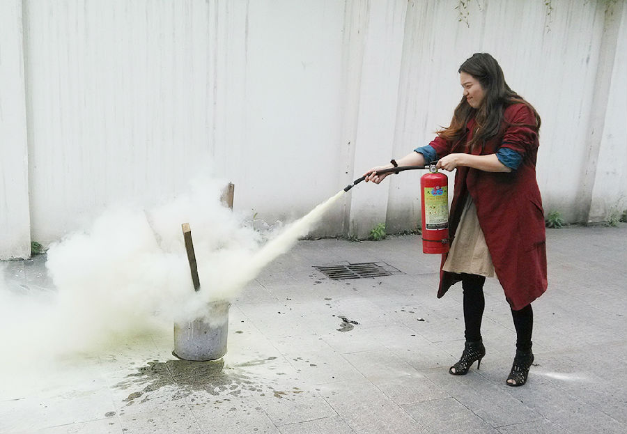 接下来,在邹教官的带领下,大家在一楼停车场区域对所学习的知识进行了实践,现场使用灭火器灭火。
