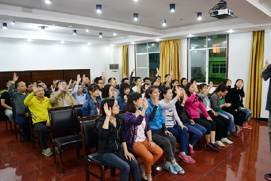 15日19:30,我们迎来了第一项培训项目“破冰和团队建设”,严教练以游戏互动的方式,让大家快速了解培训规则,融入训练氛围。最后,教练把全体人员分为两个战队并下达了任务,要求在第二天训练开始时,进行队名、口号、队歌、队旗及队形的团队展示,两队人员分别在队长的带领下,为明天的团队荣誉积极准备着。