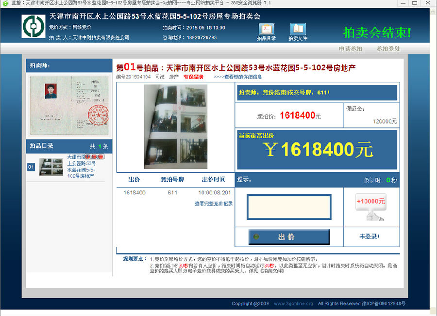 乐鱼网页版登录入口讯 经过为期半年的招商及价格调整,天津广角拍卖公司于2015年5月18日成功促成位于天津市南开区水上公园附近房产,该标的在拍卖过程中面临了一个非常严重的问题,由于各种历史遗留的原因,该标的内有案外的第三人居住,且居住人对房产拍卖的抵触情绪较严重,不允许参与竞买人员查看标的,因此造成对内部情况的了解非常困难,加之法院方面提出不负责腾房的约定总体上来说成交可能不大,但经过拍卖科室全体人员的共同努力,与第三人进行沟通并最终达成协议促成该标的的成交。成交额161.84万元,佣金按照最高院司法解释收取。