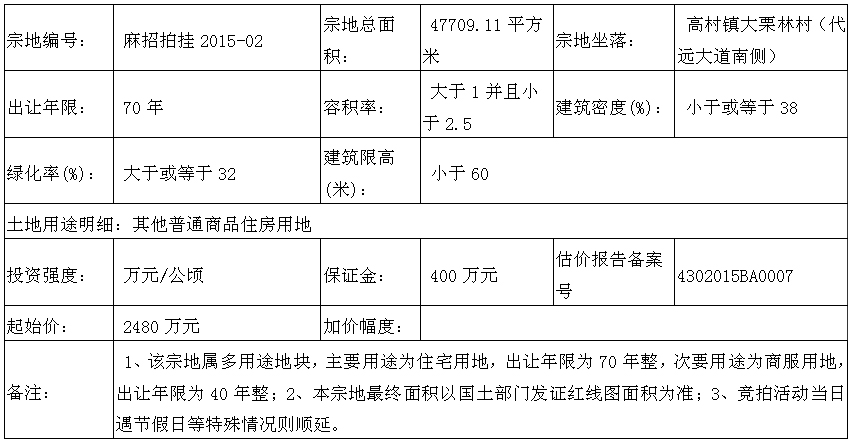 四、 本次拍卖出让的详细资料和具体要求,见拍卖出让文件。申请人可于2015年06月03日至2015年06月22日到麻阳苗族自治县国土资源局一楼大厅或长沙市天心区芙蓉中路三段426号获取拍卖出让文件。