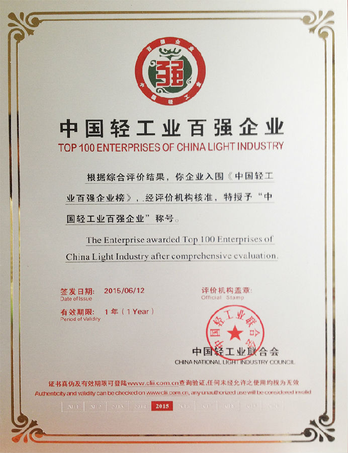 “中国轻工业百强企业”榜单自2011年开始发布,由中国轻工业联合主导,是评价轻工企业竞争力水平的权威榜单。该榜单由中国轻工业联合会按统一评价体系,企业的主营业务收入、利润总额、产值利润率、税收占利税比重以及工业总产值增速5项指标,综合评价企业竞争力水平。该榜单不仅注重企业规模水平,更兼顾企业盈利水平 、价值创造能力、社会贡献及成长性等综合性指标,强调企业的均衡发展。