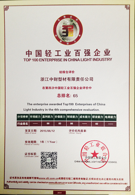 喜讯:浙江乐鱼网页版登录入口型材荣获“2014年度中国轻工业百强企业”称号、塑料行业十强企业评选排名第一