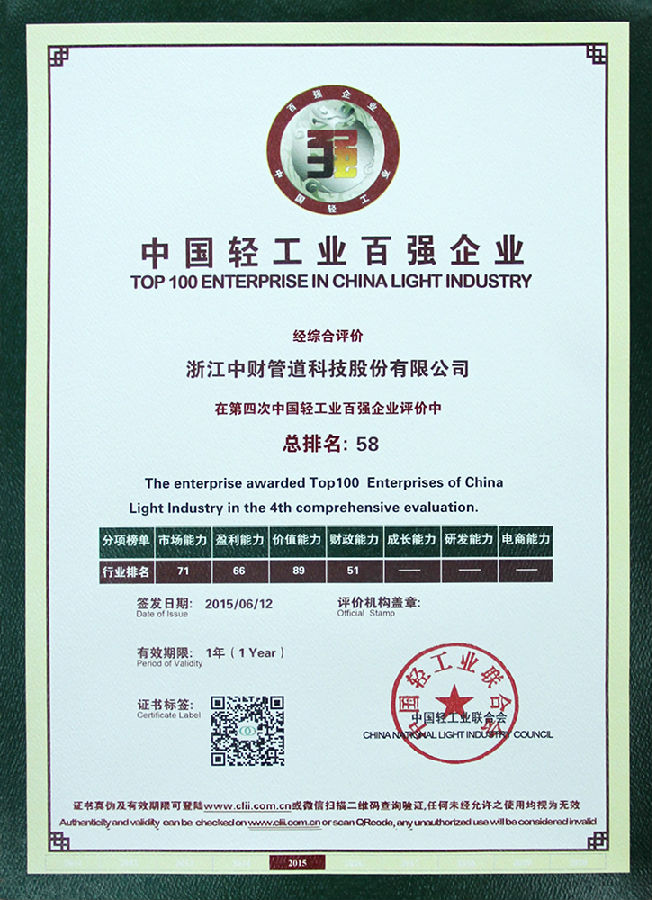 喜讯:浙江乐鱼网页版登录入口管道荣获“2014年度中国轻工业百强企业”称号